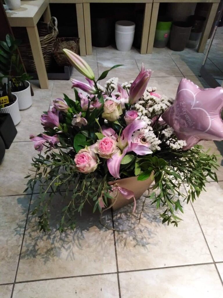Σύνθεση με λίλιουμ, τριαντάφυλλο, γυψοφίλλη,  εμπλουτισμένη με πρασινάδα